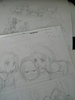 さて、ラフネームをベースに下書き+ネーム修正同時進行でいってます。絵柄も同時進行で決めてます。…馬鹿な描き方だとは思うけれど、残り時間とp数(だいたい漫画部分で22p…)を考えるとこれがベターかな、と。